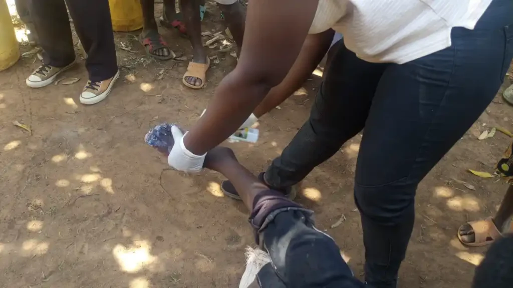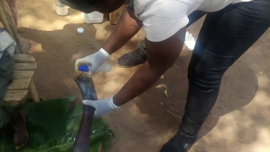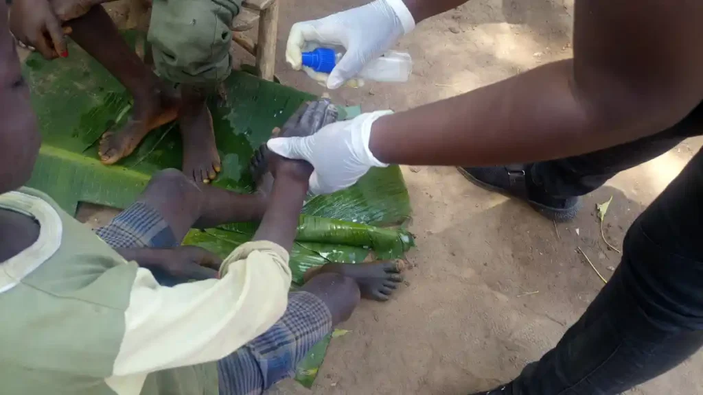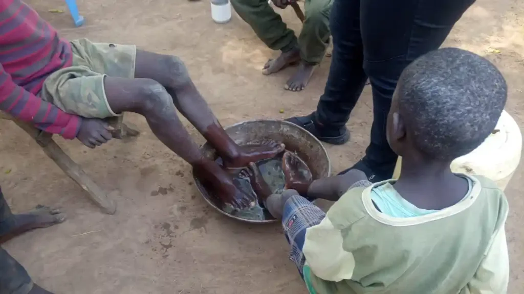 Before treatment begins, proper hygiene is essential. In this snapshot, children participating in the anti-jigger drive at Mayanja are seen soaking their feet in clean water, a crucial first step to ensure safety and effectiveness during jigger removal.
